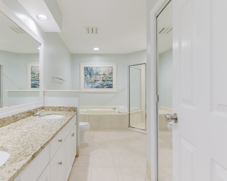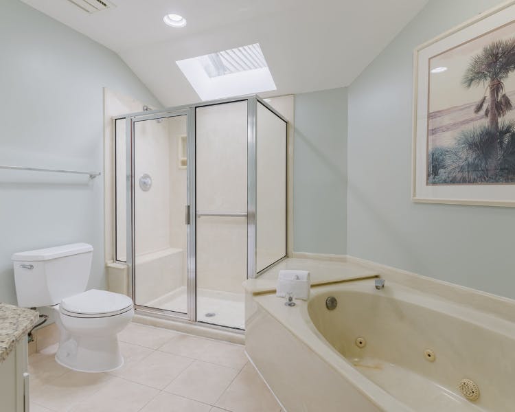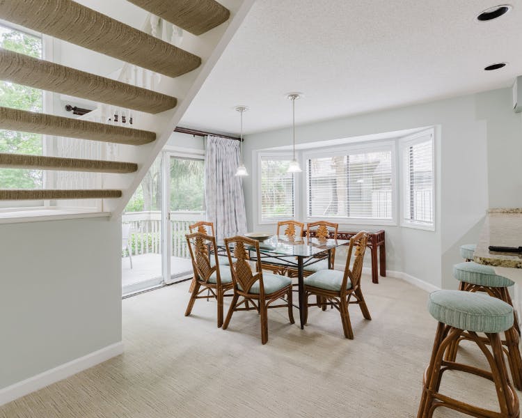 Escape to this expansive 3-bedroom, 3-bathroom end unit townhome nestled in the heart of Hilton Head Island. Ideal for families seeking relaxation or avid golfers on their annual retreat, this meticulously designed space promises a memorable stay. Step into the well-appointed kitchen boasting granite countertops and a convenient breakfast bar, perfect for whipping up home-cooked meals. The dining area, with bay window and glass doors leading to the deck, has seating for 6 guests, beckons for shared meals and laughter. Retreat to the inviting living room with its 75" Smart TV, vaulted ceilings, adorned with large picture windows framing serene views and access to the deck as well. Indulge in the ultimate relaxation within two master suites, each featuring a King bed, Cable TV, and a lavish master bath boasting a separate tub and shower. Upstairs, discover a charming third bedroom complete with two twin beds and a private bath, providing ample space for everyone.